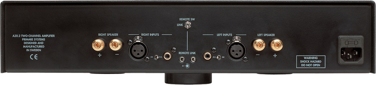 Dimensions: ![]() Primare A30.2 High Current Dual Mono Fully Balanced Power Amplifier. Stereo is all about maximizing two channels of sound. To create the right conditions for accurate stereo reproduction, each channel must be treated identically, and as a discrete entity. It must not be required to share resources with the other channel. The A30.2 is a dual-mono design, in which each channel has its own identical, dedicated mono amplifier, incorporating a heavy-duty custom-made toroidal transformer and low noise regulated power supplies. Each channel uses four ultra-fast bi-polar output devices in a push-pull configuration to preserve the fidelity of musical transients and minimise distortion. For even higher fidelity, the A30.2 can be converted easily to balanced mono operation. The A30.2 is robustly constructed from 2 mm steel. Heavy-duty gold-plated loudspeaker terminals and gold-plated RCA and XLR inputs are further evidence of Primare's dedication to excellence. The A30.2 can be partnered with the A30.5 to provide seven identical channels of amplification for multi-channel music and movie applications. The result is music and movie sound as vibrant and vital as the moment it was recorded, from an amplifier that is as beautiful in the making, as it is in the listening.